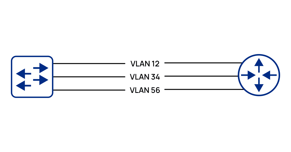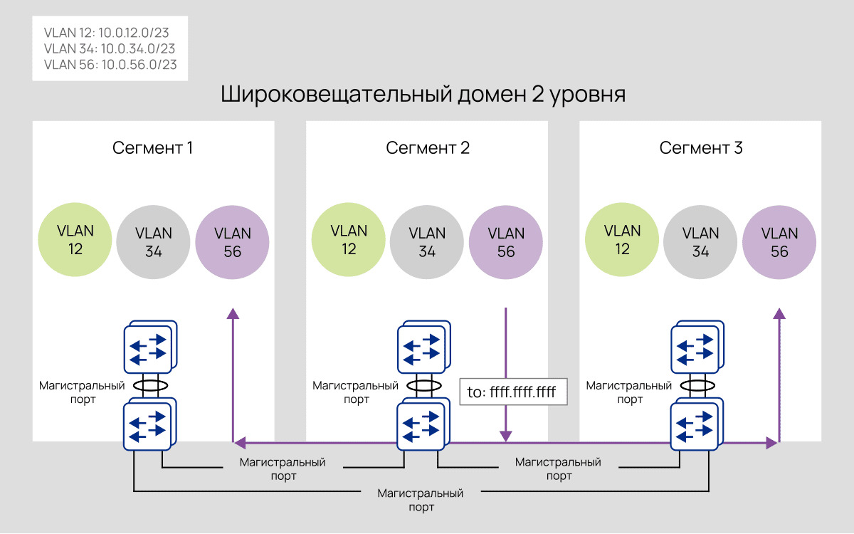 На рис. 2 сети VLAN 12, 34 и 56 распределены по трём сегментам, которые соединены магистральными линиями, позволяющими использовать VLAN 12, 34 и 56. Таким образом, вся сеть представляет собой один домен уровня 2, хотя он и разделён на три VLAN.