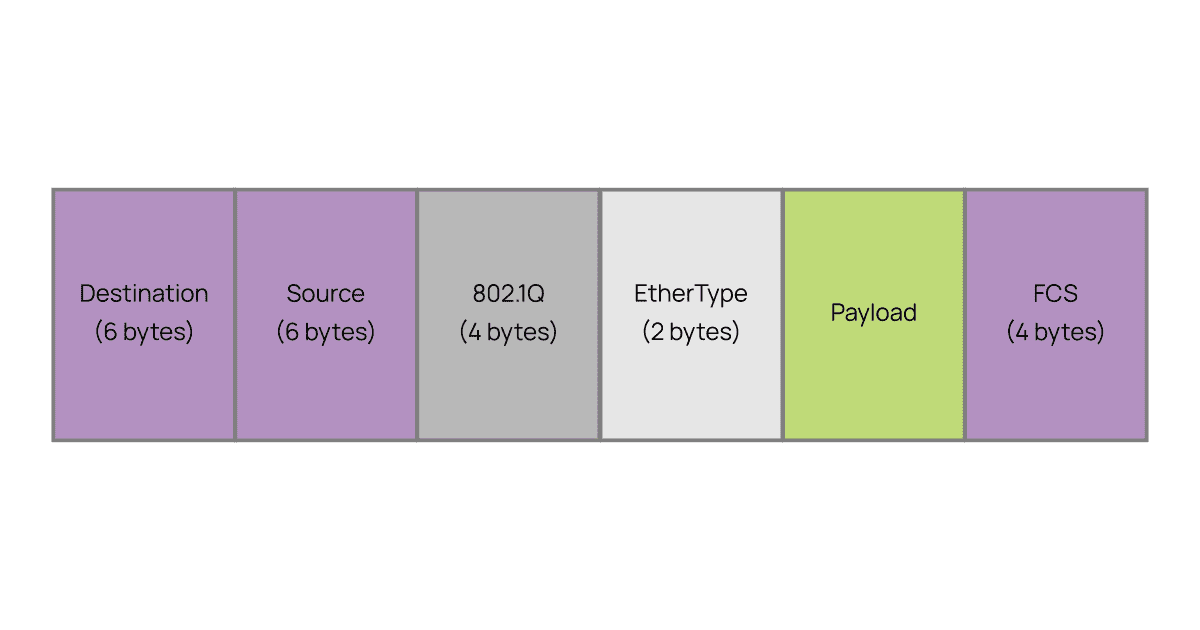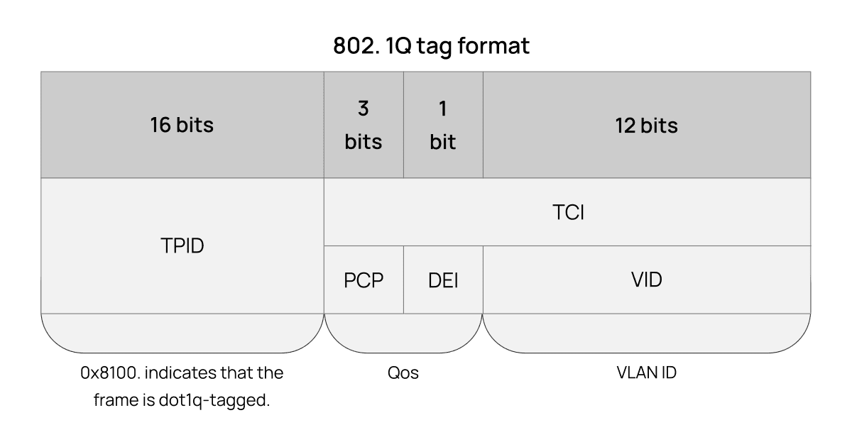Поле TPID всегда имеет шестнадцатеричное значение 8100, это указывает на то, что кадр помечен dot1q. Далее поля PCP и DEI используются для QoS. И, наконец, VLAN ID, который определяет, к какой VLAN принадлежит кадр.